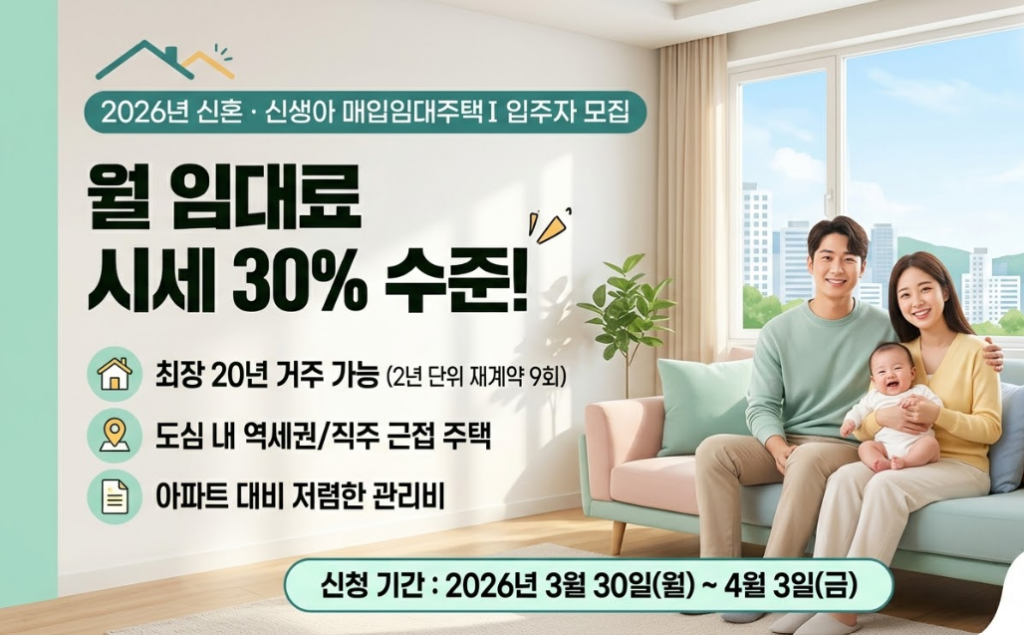 [전국] 2026년 신혼·신생아 매입임대주택Ⅰ 입주자 모집, 월 임대료 시세 30% 수준 분석 (2026)